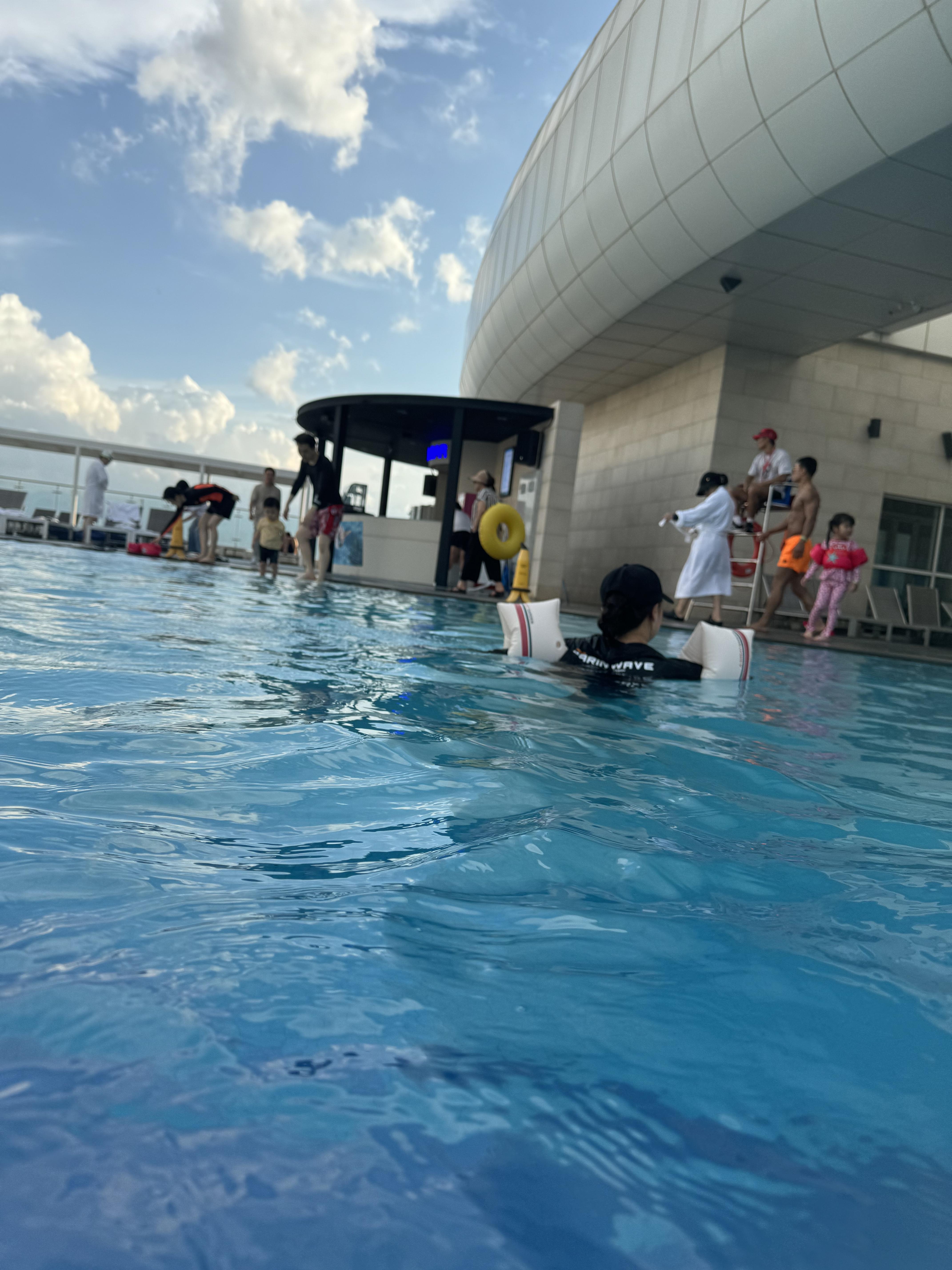 뷰가 너무 근사하죠? 밤이 되면 조명이 켜지며 더 멋있어요. 근데 여기 다 좋은데 수영장 관리가 조금 안 되는 것 같습니다. 솔직히 수영장 수질이 너무 심합니다. 사람이 많아서 그런 것도 있겠지만 너무 더러워서 솔직히 얼굴 담그고 수영 못했습니다. 뭐가 둥둥 많이 떠다니고 여기저기 곰팡이에 수영장 뷰만 좋지 1인 4만 원이나 받으면서 수영장 관리를 이렇게 한다니 조금 심하더라고요.