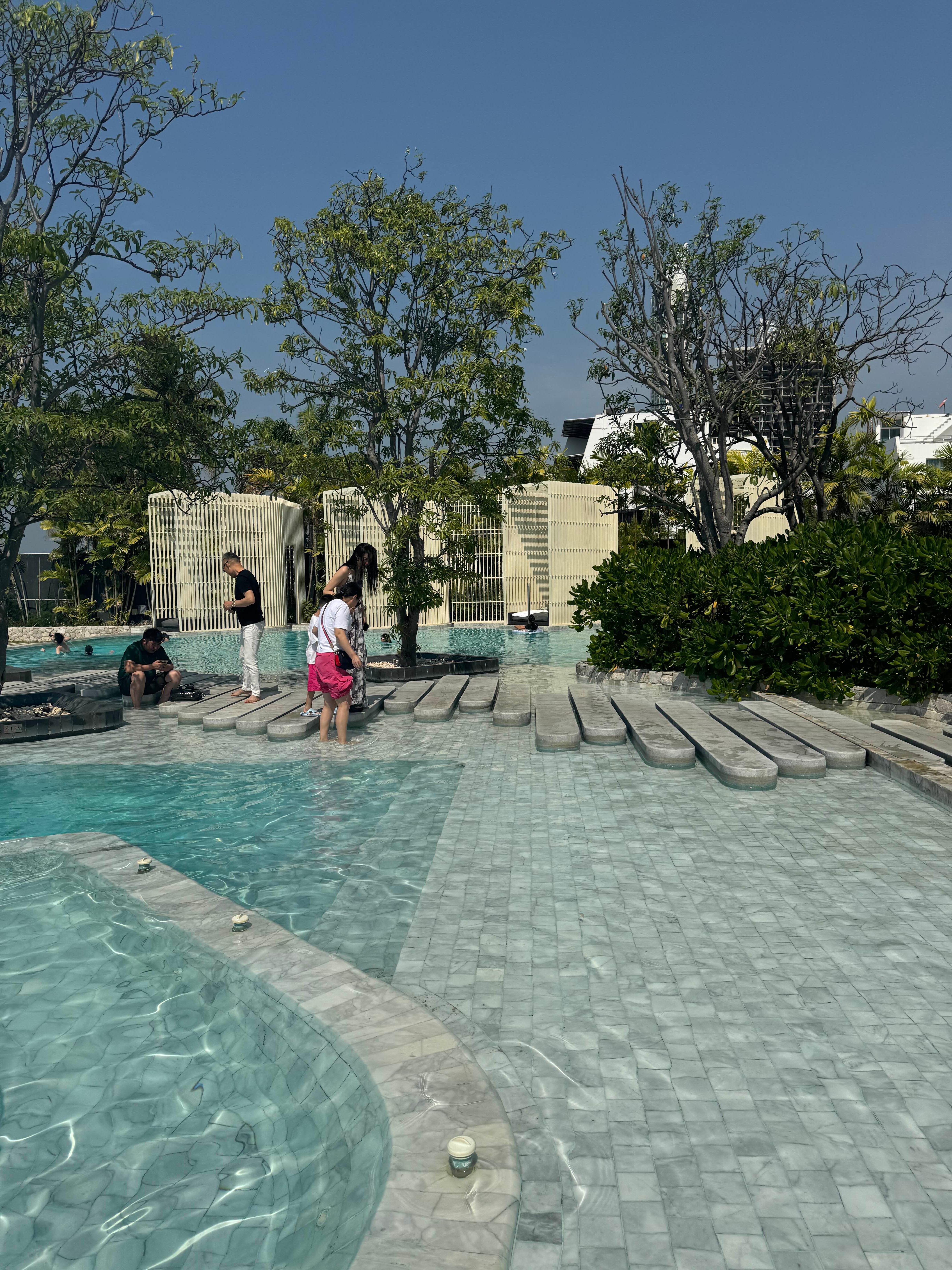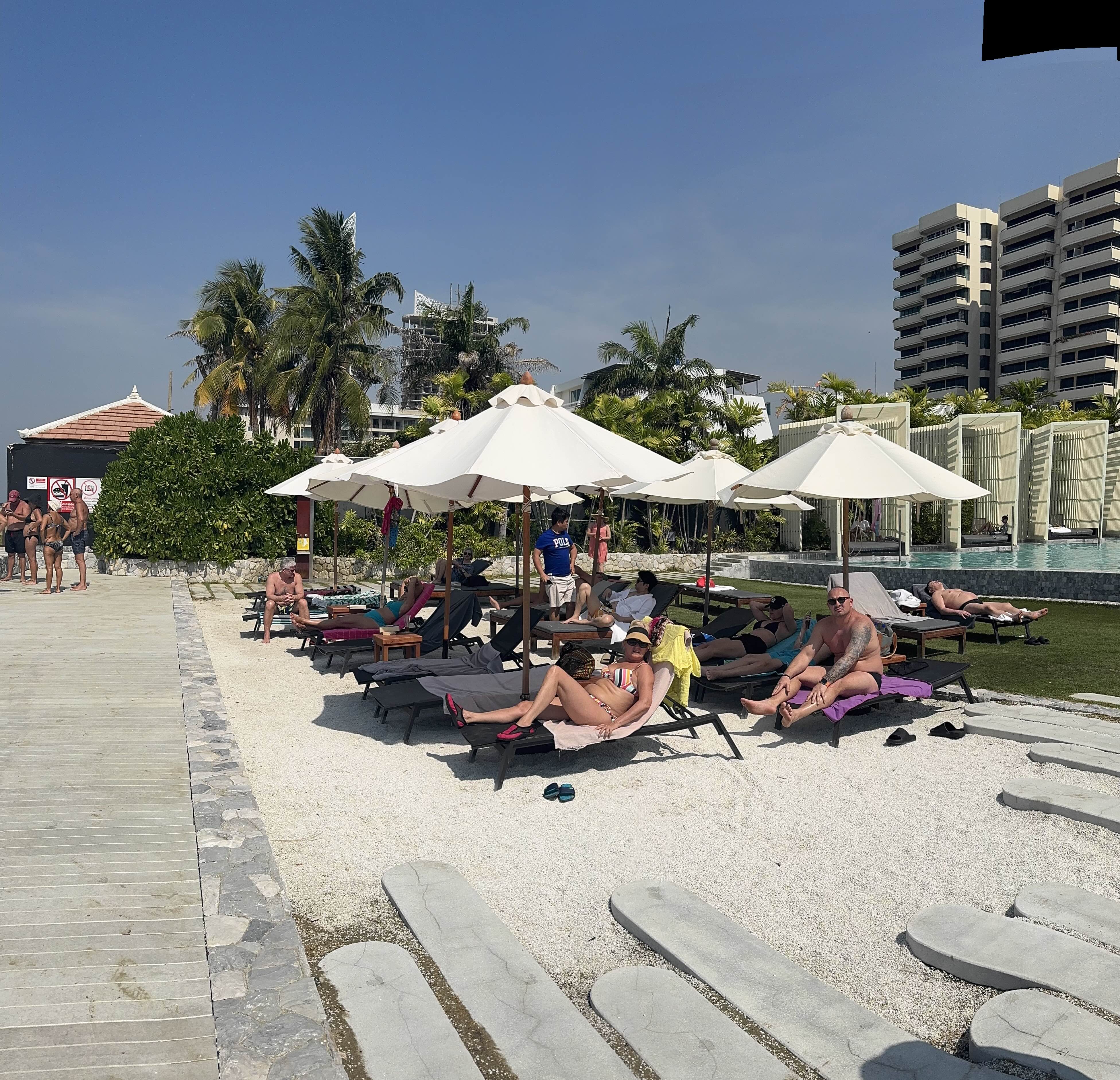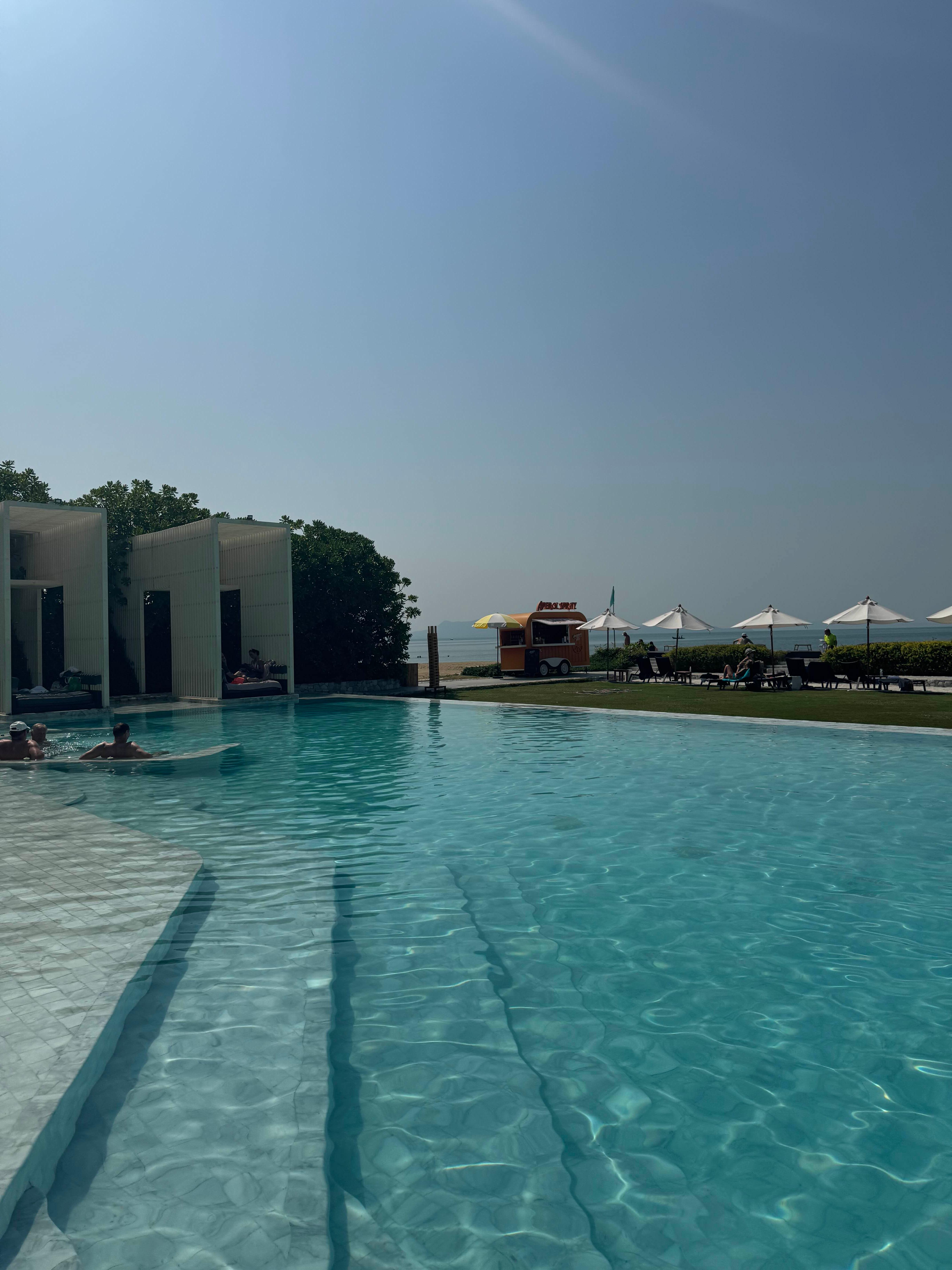 수영장과 해변은 바로 붙어 있어 편했습니다. 제가 갔을 때는 조금 추워서 해변은 물이 찼고 수영장은 놀만 했습니다. 썬베드와 방갈로는 자리가 조금 협소한 편이라 눈치싸움 해야 했습니다. 저희는 여기서 20분 정도밖에 안 놀아서 그냥 대충 짐 올려두고 놀다가 뒤쪽 수영장으로 옮겼습니다.