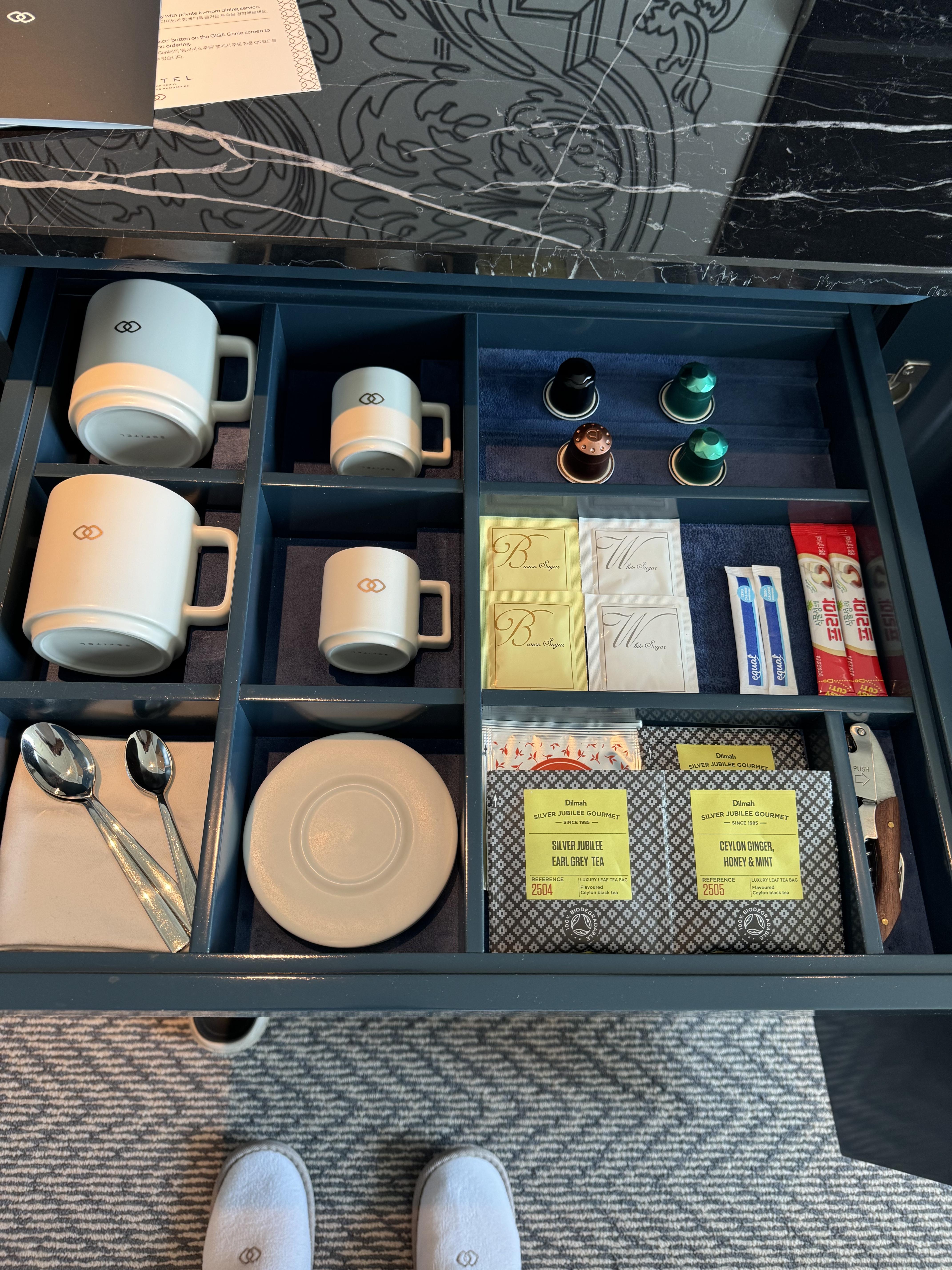 네스프레소 기계와 캡슐이 구비되어 있고 나머지는 구매해서 먹을 수 있습니다.