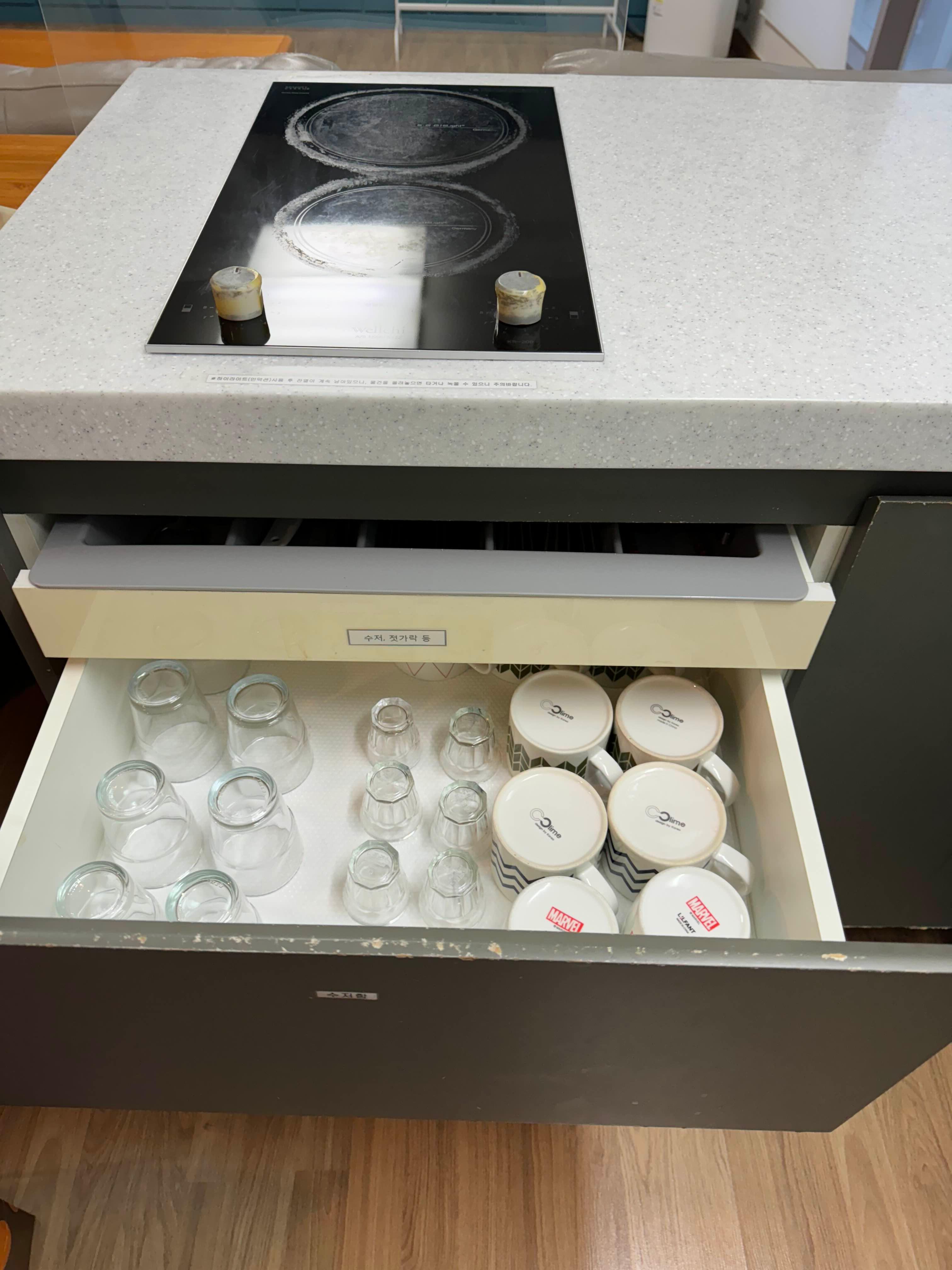 주방엔 정수기랑 전자렌지등 있을 건 다 있었습니다. 정수기 있는 게 제일 좋았습니다. 근처에 편의점이 없어 물이 떨어지면 곤란했을 건데 정수기 덕분에 괜찮았습니다. 뭐 술이 부족해 더사오긴 했지만 주방에 모든 게 다 있어서 불편함은 없었지만 전기레인지가 너무 약해서 물하나 끓이는데 조금 오래 걸렸습니다. 저희가 가리비를 삶는다고 물을 올렸는데 생각보다 오래 걸렸습니다. 그것 말고 불편한 것은 없었습니다. 어차피 고기는 옆에 그릴을 빌려서 (유료) 고기는 구울 수 있어서 큰 불편함은 없었습니다.