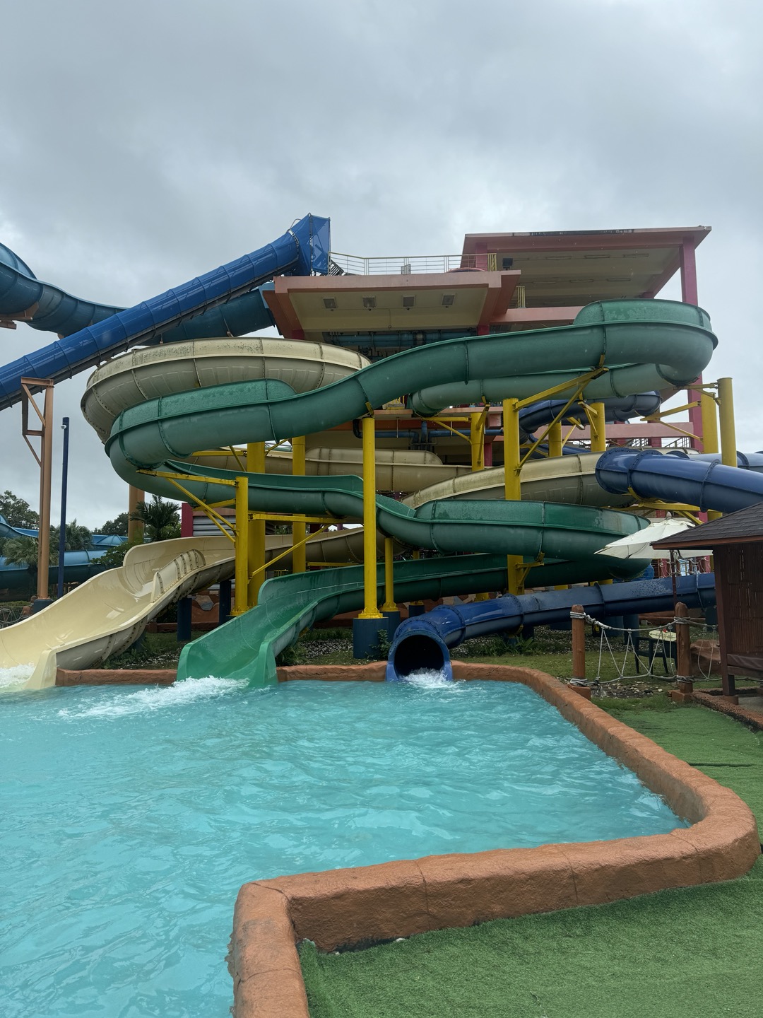 워터파크의 워터슬라이드는 정말 다양했습니다. 날씨가 흐려서 너무 놀기 좋았습니다. 햇빛이 쨍쨍하면 더워서 힘든데 날씨가 도와줘서 정말 열심히 놀 수 있었어요. 사람이 많이 없어서 워터슬라이드는 대기 없이 바로바로 탔고 너무 재밌었습니다. 특히 아래사진의 워터슬라이드가 최고 스릴 있고 재밌었습니다.